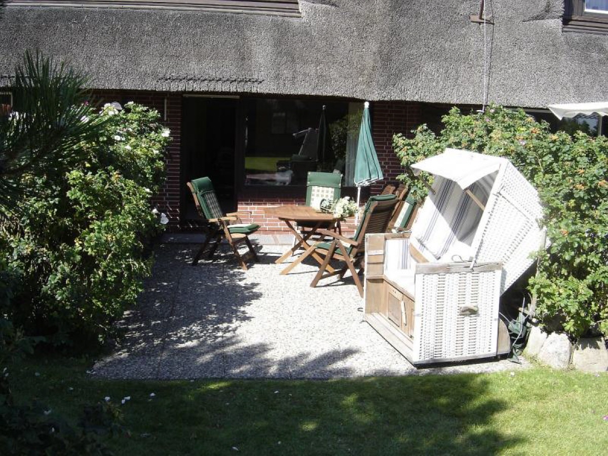 Auf der schönen nach südosten ausgerichteten Terrasse können Sie in den schönen und hochwertigen Gartenmöbeln mit Strandkorb die Ruhe, die Sonne, den Wattblick und die gute Luft genießen.