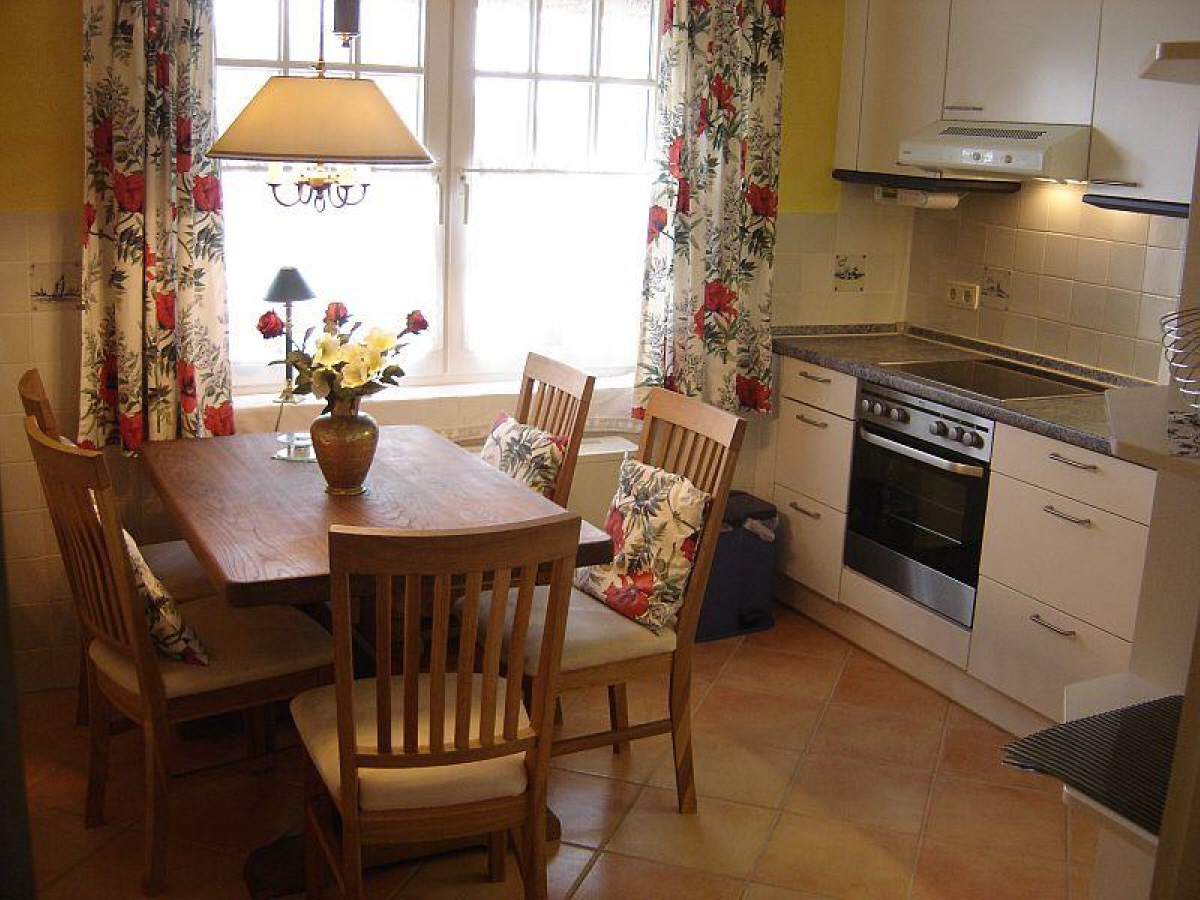 Die Küche ist ein separater großer Raum mit integrierten Eßbereich (5 Sitzplätze). Sie ist ausgestattet, mit einem großen Kühlschrank mit integriertem Gefrierfach, Geschirrspüler, 4-Kochstellen-Ceranfeld, Heißluftbackofen, separaten Mikrowelle, Radio und weiteren Küchengeräten wie einer Kaffeemaschine, Wasserkocher, Eierkocher, Mixer, Waffeleisen..... Für Liebhaber von besonderem Kaffeegenuß halten wir eine Padmaschine bereit.