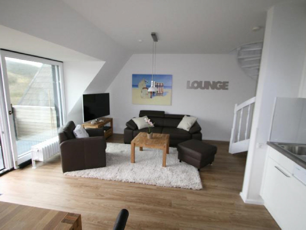 Im Wohnbereich kann man so richtig die Seele baumeln lassen. Entweder man verfolgt auf dem Flachbildschirm-Fernseher das Tagesgeschehen, oder täumt einfach über die Dünen bis zum Meer....